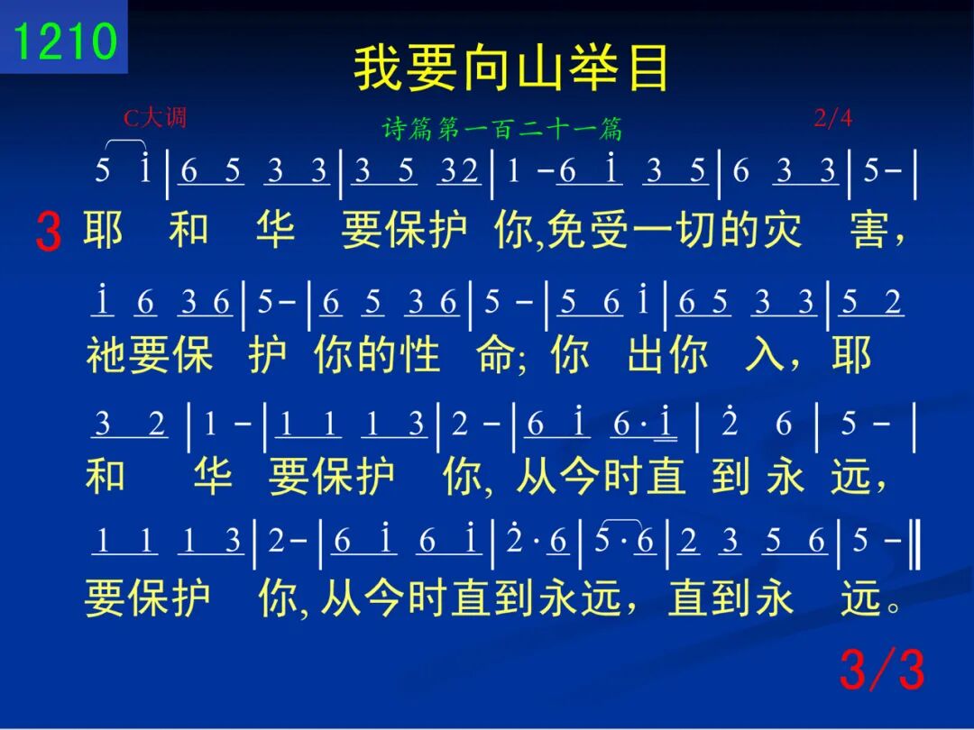 我要向山举目,我的帮助从何而来。我的帮助,我的帮助,从造天地的耶和华而来;祂必不叫你的脚摇动,保护你的必不打盹,必不打盹。 二 保护以色列的,也不打盹,也不睡觉。保护你的是耶和华,耶和华在你右边荫庇你;白日太阳必不伤你,夜间月亮必不害你,必不害你。 三 耶和华要保护你,免受一切的灾害,祂要保护你的性命;你出你入,耶和华要保护你,从今时直到永远,要保护你,从今时直到永远,直到永远。