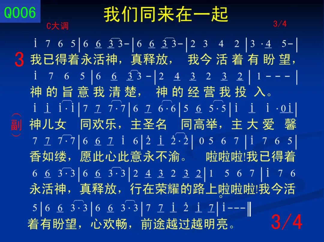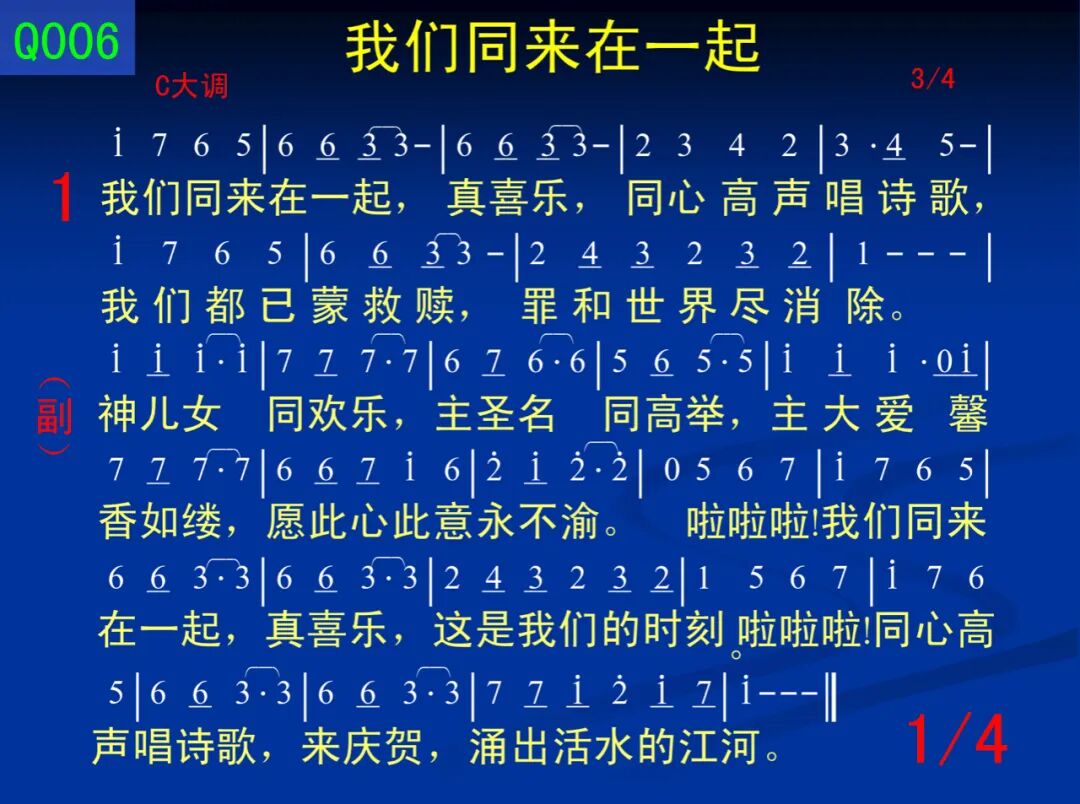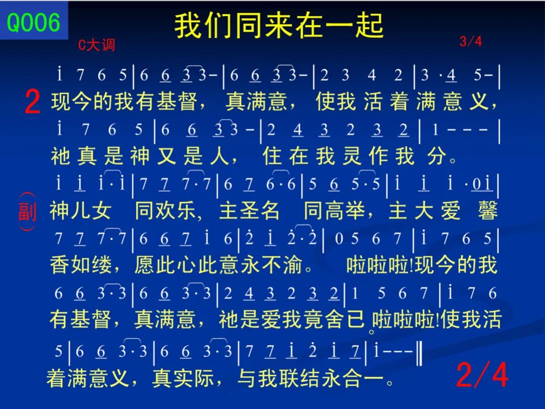我们同来在一起,真喜乐,同心高声唱诗歌,我们都已蒙救赎,罪和世界尽消除。神儿女同欢乐,主圣名同高举,主大爱馨香如缕,愿此心此意永不渝。啦啦啦!我们同来在一起,真喜乐,这是我们的时刻。啦啦啦!同心高声唱诗歌,来庆贺,涌出活水的江河。 二 现今的我有基督,真满意,使我活着满意义,祂真是神又是人,住在我灵作我分。神儿女同欢乐,主圣名同高举,主大爱馨香如缕,愿此心此意永不渝。啦啦啦!现今的我有基督,真满意,祂是爱我竟舍已。啦啦啦!使我活着满意义,真实际,与我联结永合一。 三 我已得着永活神,真释放,我今活着有盼望,神的旨意我清楚,神的经营我投入。神儿女同欢乐,主圣名同高举,主大爱馨香如缕,愿此心此意永不渝。啦啦啦!我已得着永活神,真释放,行在荣耀的路上。啦啦啦!我今活着有盼望,心欢畅,前途越过越明亮。 四 我今活在召会中,真安息,满足、享受无可比,和睦同居真美好,肢体相爱同建造。神儿女同欢乐,主圣名同高举,主大爱馨香如缕,愿此心此意永不渝。啦啦啦!我今活在召会中,真安息,我是快乐的肢体。啦啦啦!满足、享受无可比,真洋溢,赞美之声四起。