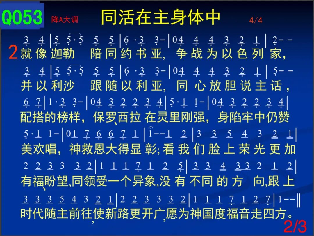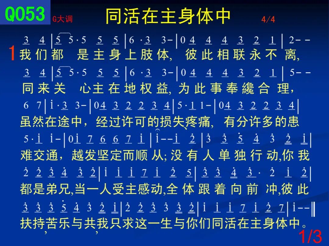 一、我们都是主身体肢体,彼此相连永不离,同来关心主在地权益,为此事奉才合理,虽然在途中,经过许可的损失疼痛,有分许多的患难、交通,越发坚定而顺从;没有人单独行动,你我都是弟兄,当一人受主感动,全体跟着向前冲,彼此扶持苦乐与共,我只求这一生与你们能同活主身体中。