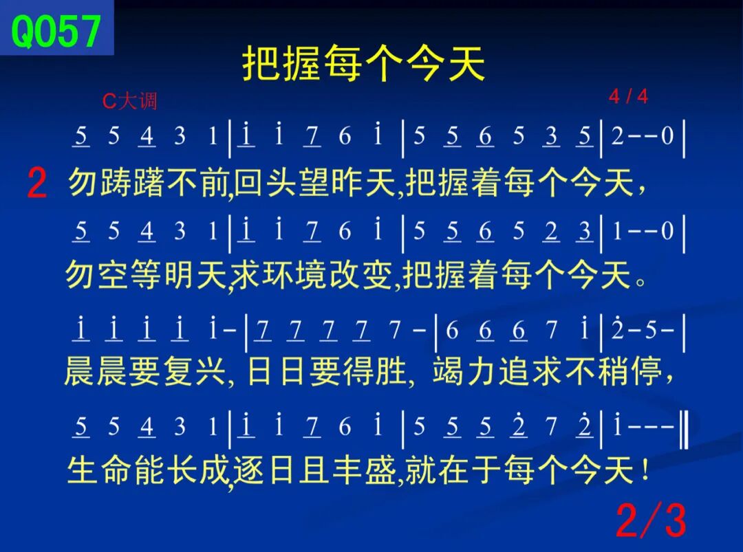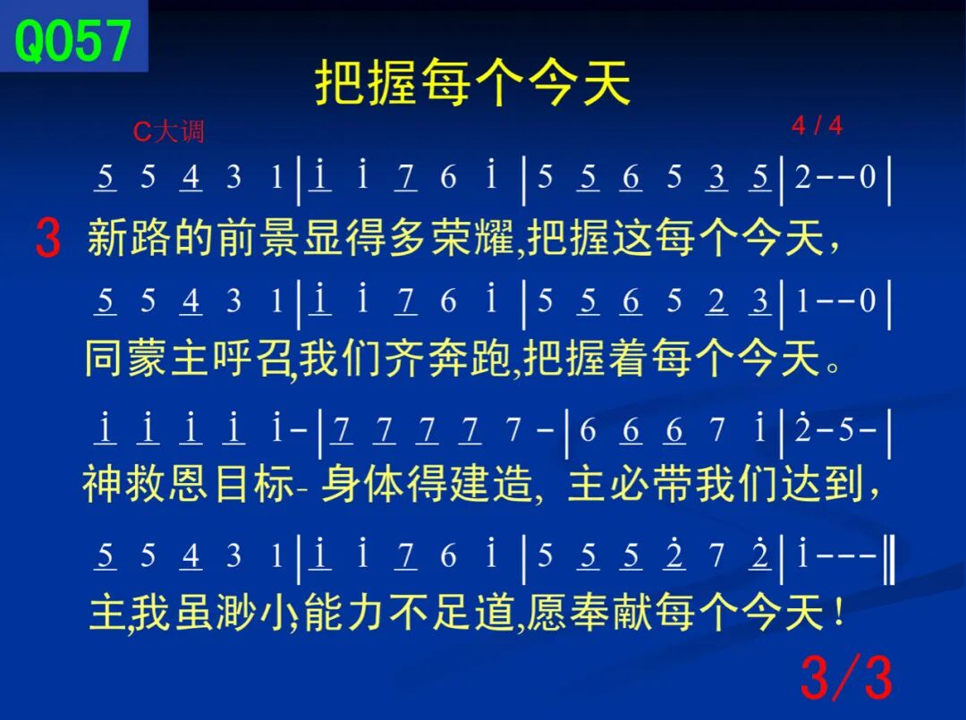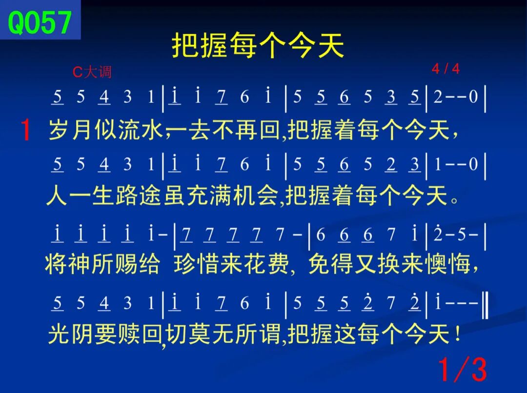 ****岁月似流水,一去不再回,把握着每个今天, ****人一生路途虽充满机会,把握着每个今天。 ****将神所赐给珍惜来花费,免得又换来懊悔, ****光阴要赎回,切莫无所谓,把握这每个今天! ****二、 ****勿踌躇不前,回头望昨天,把握着每个今天, ****勿空等明天,求环境改变,把握着每个今天。 ****晨晨要复兴,日日要得胜,竭力追求不稍停, ****生命能长成,逐日且丰盛,就在于每个今天! ****三、 ****新路的前景显得多荣耀,把握着每个今天, ****同蒙主呼召,我们齐奔跑,把握着每个今天。 ****神救恩目标--身体得建造,主必带我们达到, ****主,我虽渺小,能力不足道,愿奉献每个今天!