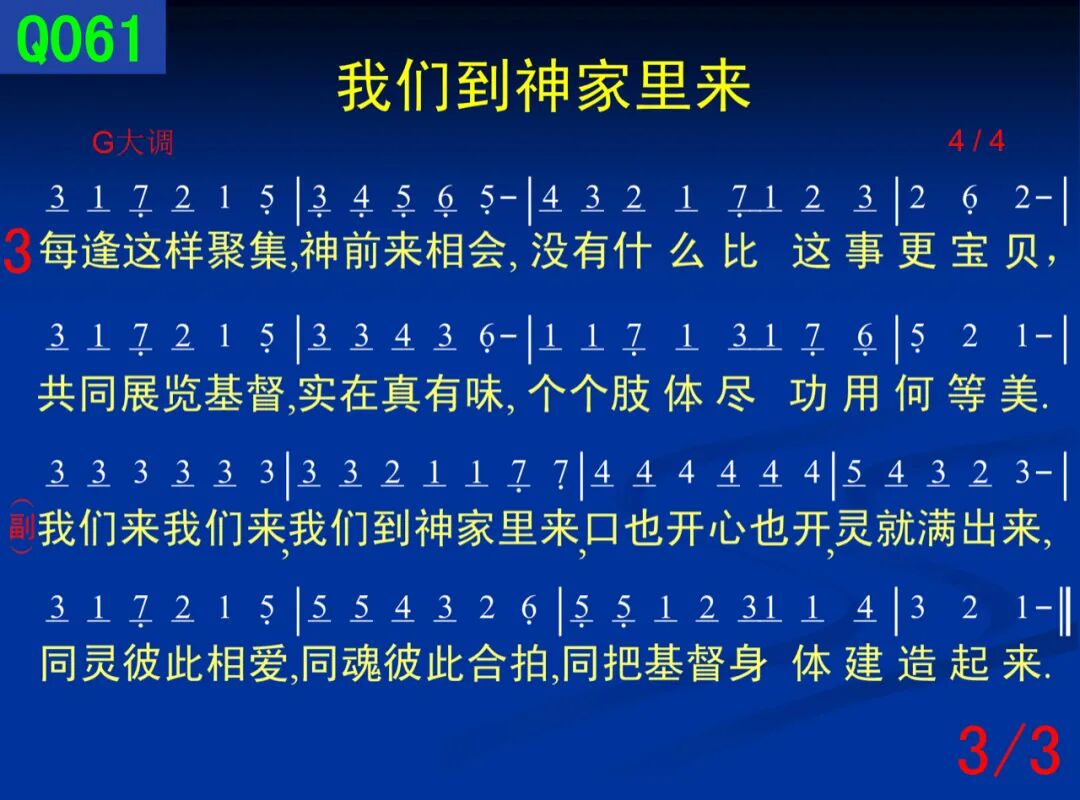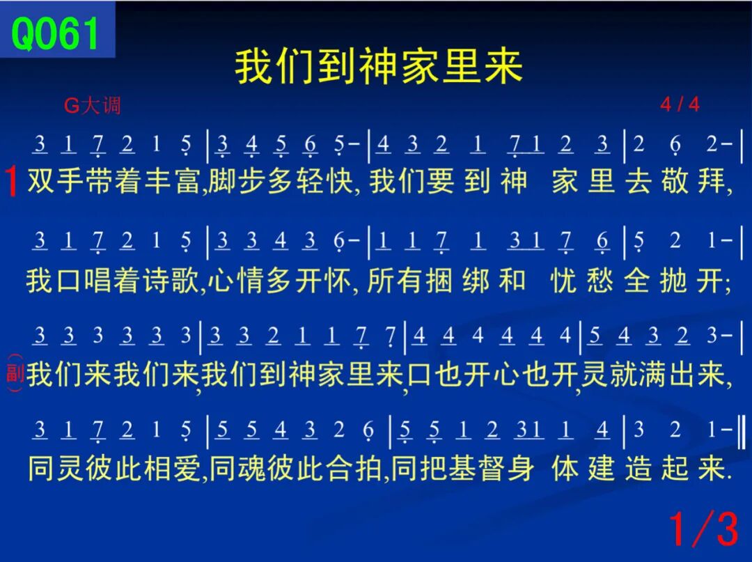 ****我们要到神家里去敬拜, ****我口唱着诗歌,心情多开怀, ****所有捆绑和忧愁全抛开; ****二、 ****当一来到聚会,我灵就释放, ****将我所有欢乐的来献上, ****我有诗歌就唱,有灵感就讲, ****使神和人得饱足同分享; ****三、 ****每逢这样聚集,神前来相会, ****没有什么比这事更宝贝, ****共同展览基督,实在真有味, ****个个肢体尽功用何等美。 ****副: ****我们来我们来,我们到神家里来, ****口也开心也开,灵就满出来, ****同灵彼此相爱,同魂互相合拍, ****同把基督身体建造起来。