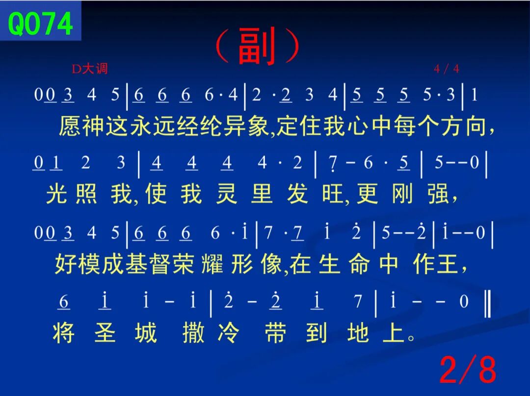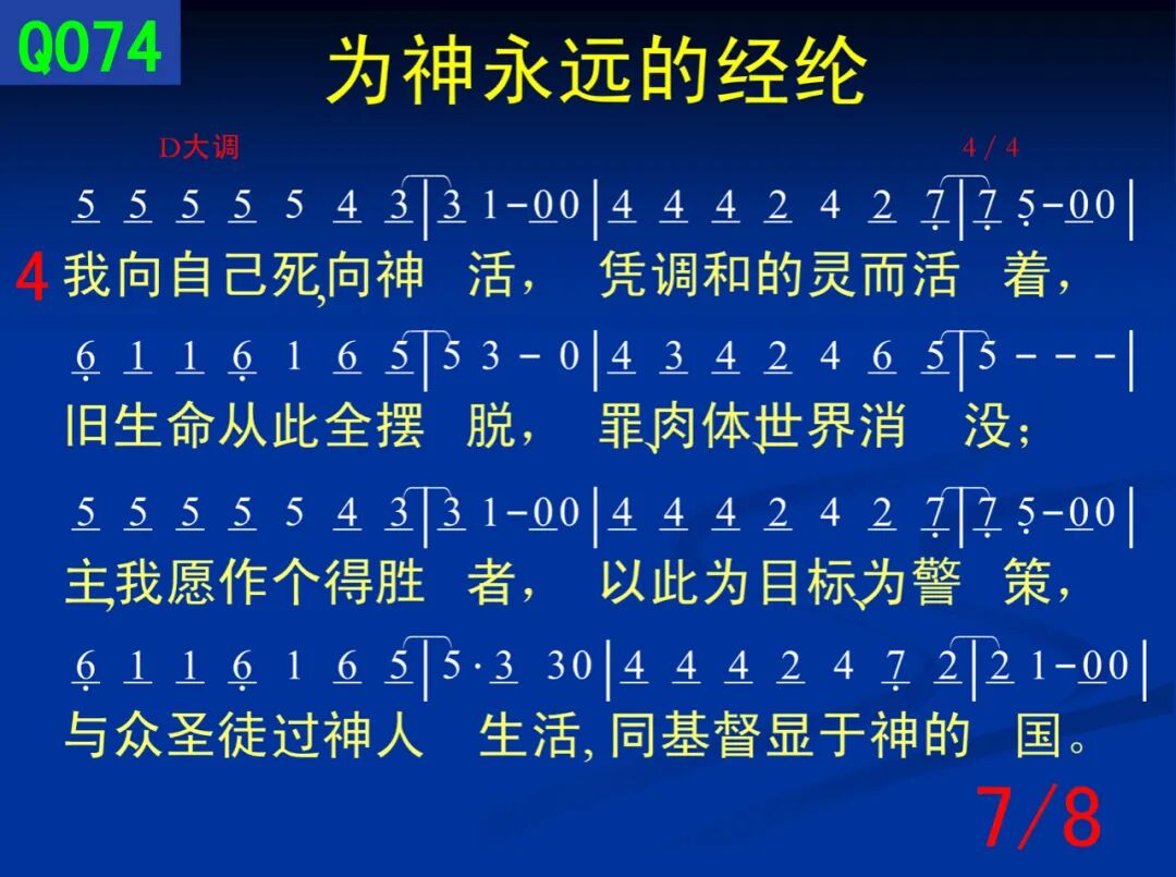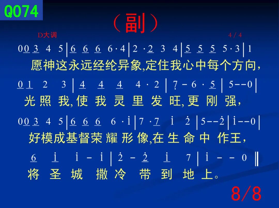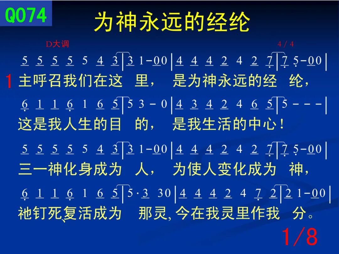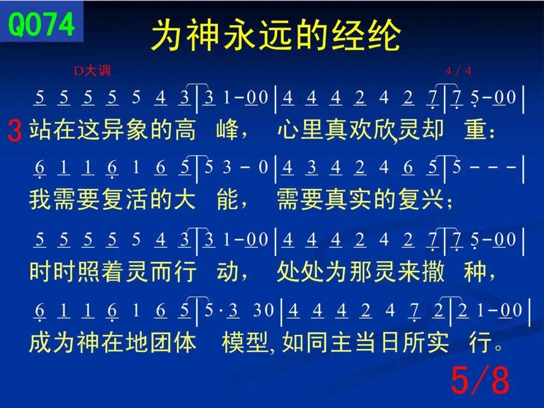 一、 主呼召我们在这里,是为神永远的经纶, 这是我人生的目的,是我生活的中心! 三一神化身成为人,为使人变化成为神, 祂钉死、复活成为那灵,今在我灵里作我分。 二、 哦,在这蒙福的境地,神与人联调成为一, 留在基督这美地里,享受基督作实际; 珍惜这无上的权力,建造主生机的身体, 作基督显身团体大器,将见证普及在各地。 三、 站在这异象的高峰,心里真欢欣,灵却重; 我需要复活的大能,需要真实的复兴; 时时照着那灵而行动,处处为那灵来撒种, 成为神在地团体模型,如同主当日所实行。 四、 我向自己死,向神活,凭调和的灵而活着, 旧生命从此全摆脱,罪、肉体、世界消没; 主,我愿作个得胜者,以此为目标、为警策, 与众圣徒过神人生活,同基督显于神的国。 副: 愿神这永远经纶异象,定住我心中每个方向, 光照我,使我灵里发旺,更刚强, 好模成基督荣耀形像, 在生命中作王,将圣城撒冷带到地上。