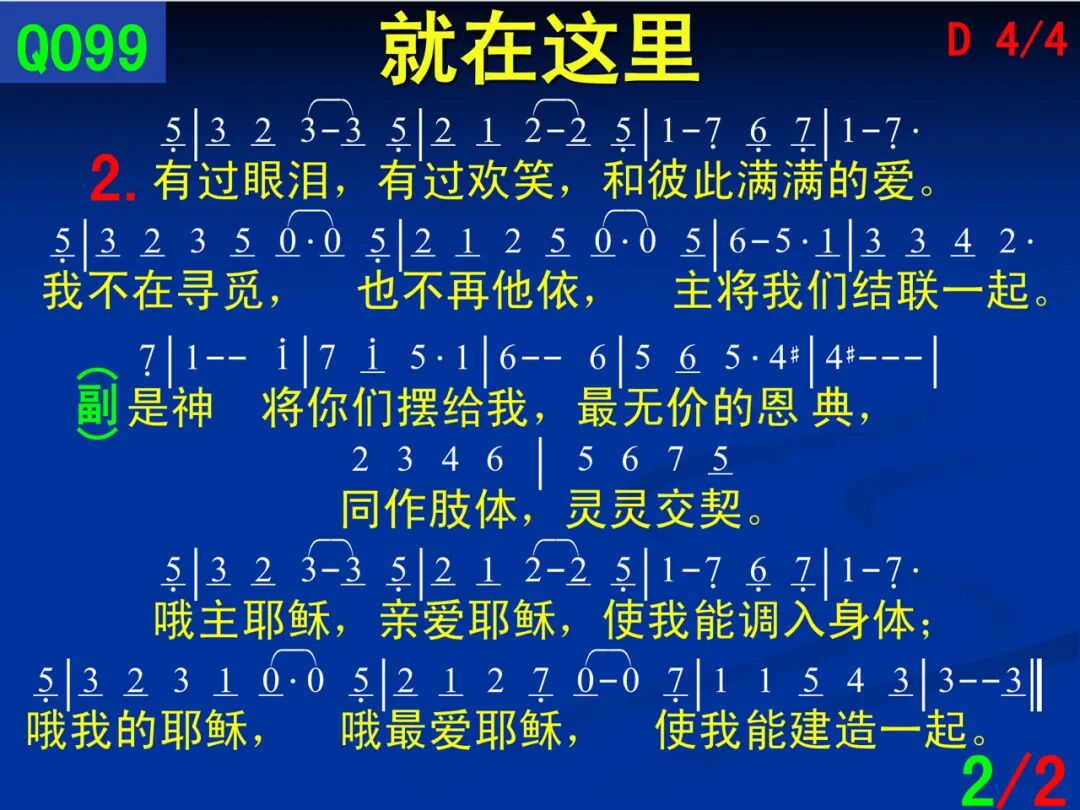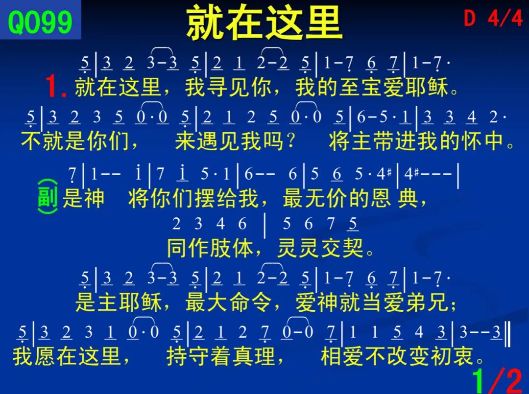 一、 就在这里,我寻见你,我的至宝爱耶稣。 不就是你们,来遇见我吗?将主带进我的怀中。 二、 有过眼泪,有过欢笑,和彼此满满的爱。 我不在寻觅,也不再他依,主将我们结联一起。 副、 是神将你们摆给我,最无价的恩典, 同作肢体,灵灵交契。 是主耶稣,最大命令,爱神就当爱弟兄; 我愿在这里,持守着真理,相爱不改变初衷。 哦主耶稣,亲爱耶稣,使我能调入身体; 哦我的耶稣,哦最爱耶稣,使我能建造一起。
