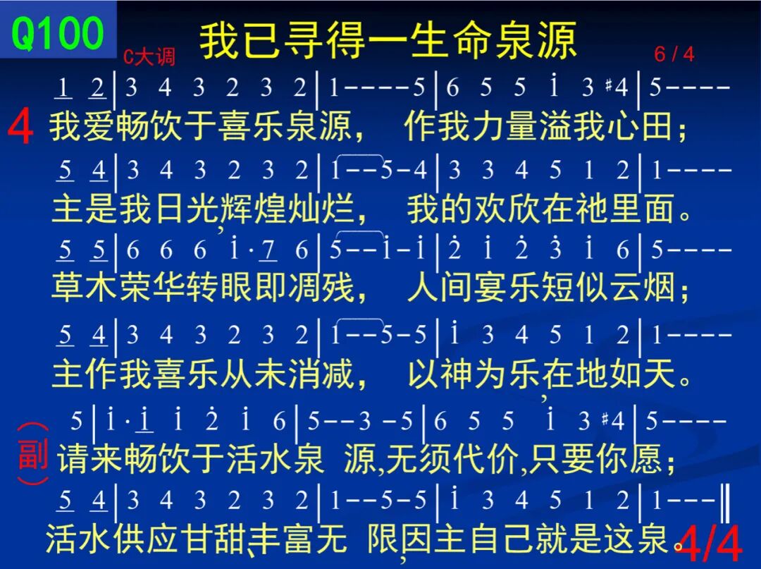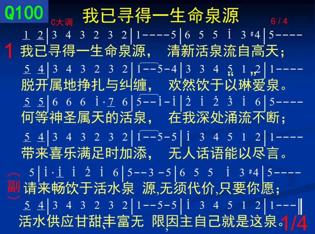 一、 我已寻得一生命泉源,清新活泉流自高天, 脱开属地挣扎与纠缠,欢然饮于以琳爱泉。 何等神圣属天的活泉,在我深处涌流不断, 请来畅饮于活水泉源,无人话语能以尽言。 二、 我今投靠于洗罪泉源,洗净一切污秽罪愆, 借主宝血我罪得赦免,洁白如雪立于神前。 蒙神称义非凭我优点,乃因基督活我里面, 属天性情我取用无间,在祂里面我得完全。 三、 恩主也是我医治泉源,作我秘诀供应无限, 远超人智慧所及所见,也非财富可以兑现。 这医治活泉神圣完全,流自救主被刺肋边, 他受鞭伤使我得康健,又来安家在我心间。 四、 我爱畅饮于喜乐泉源,作我力量溢我心田, 主是我日光辉娘灿烂,我的欢欣在祂里面。 草木荣华转眼即凋残,人间宴乐短似云烟, 主作我喜乐从未消减,以神为乐在地如天。 副: 请来畅饮于活水泉源,无须代价只要你愿。 活水供应甘甜丰富无限,因主自己就是这泉。