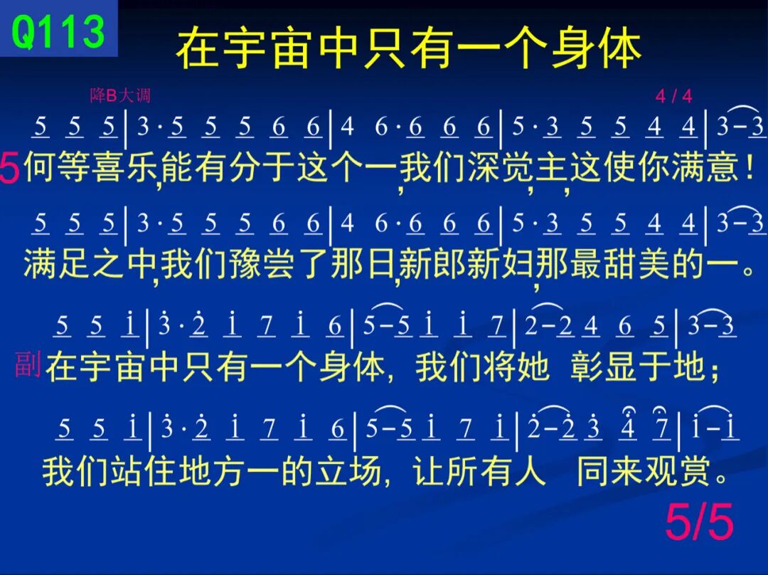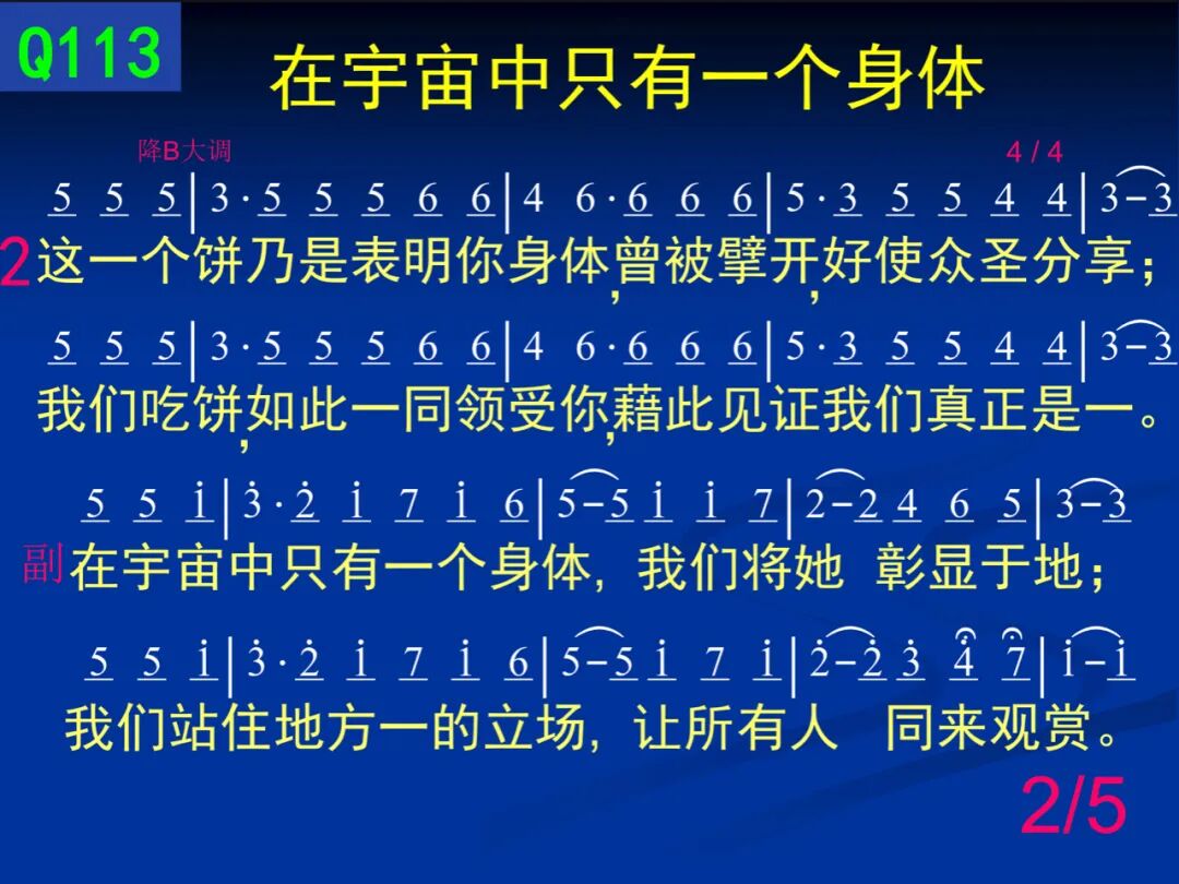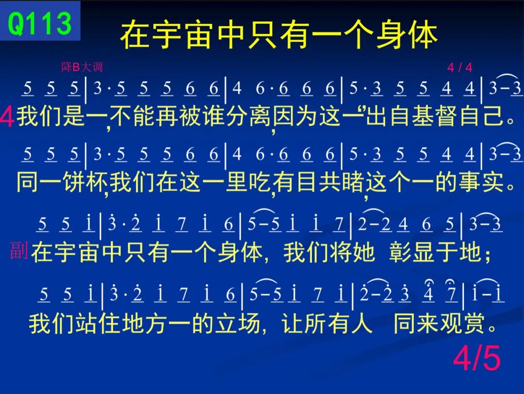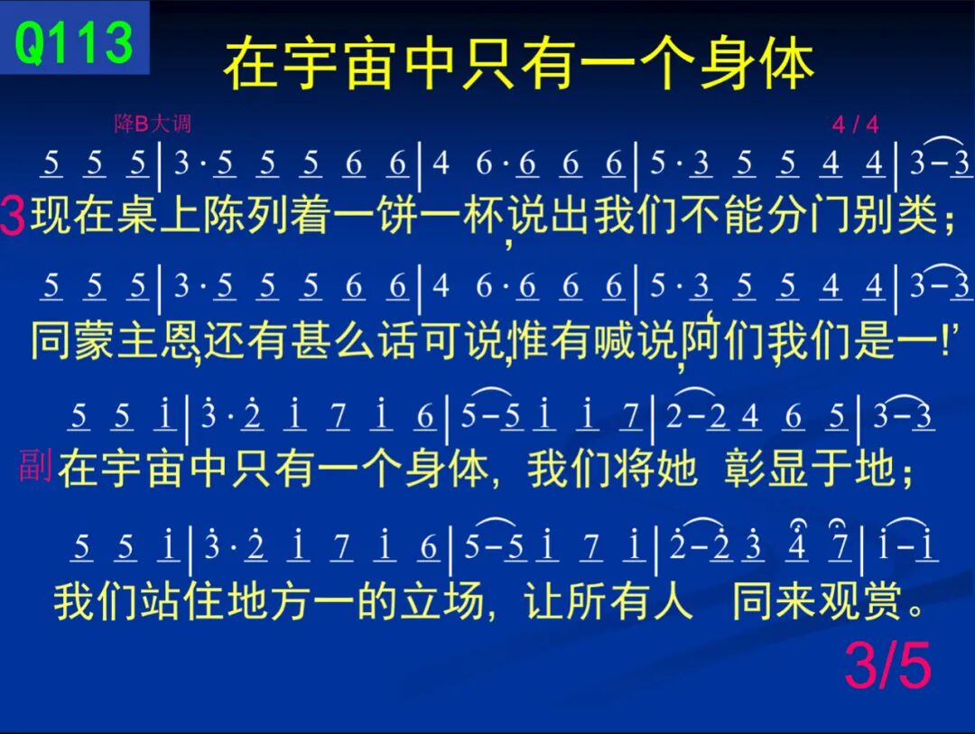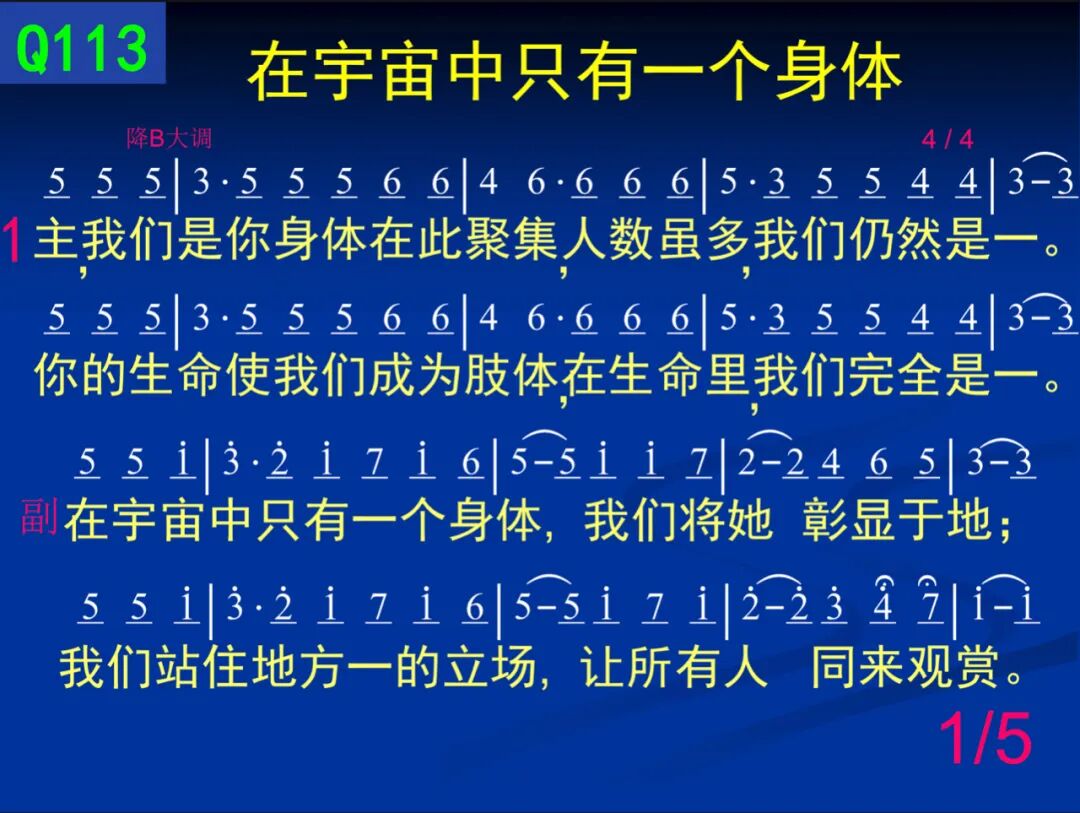 一、 主,我们是你身体在此聚集,人数虽多,我们仍然是一。 你的生命使我们成为肢体,在生命里,我们完全是一。 二、 这一个饼乃是表明你身体,曾被掌开,好使众圣分享; 我们吃饼,如此一同领受你,借此见证我们真正是一。 三、 现在桌上陈列着一饼一杯,说出我们不能分门别类; 同蒙主恩,还有什么话可说,惟有喊说:“阿们,我们是一!” 四、 我们是一,不能再被谁分离,因为这“一”出自基督自己。 同一饼杯,我们在这一里吃,有目共睹这个一的事实。 五、 何等喜乐,能有分于这个一!我们深觉,主,这使你满意! 满足之中,我们预尝了那日,新郎新妇那最甜美的一。 副: 在宇宙中只有一个身体,我们将她彰显于地; 我们站住地方一的立场,让所有人同来观赏。