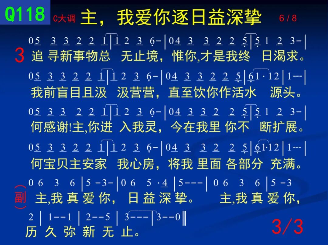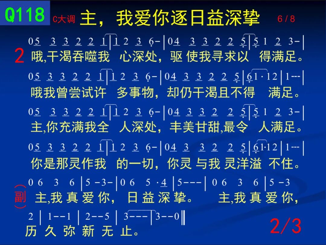 主,我爱你逐日益深挚, 主,我爱你今日胜昨日。 我不能再活无你之处, 我不能重步往日行径。 2 哦,在往昔无你岁月中, 当我失丧,你来施拯救。 我每忆过往其余年日, 虚空心痛并潸然泪流。