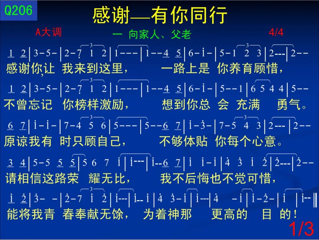 1.感谢你,让我来到这里,一路上是你养育顾惜,不曾忘记你榜样激励,想到你总会充满勇气。原谅我有时只顾自己,不够体贴你每个心意。请相信这路荣耀无比,我不后悔也不觉可惜,能将我青春奉献无余,为着神那更高的目的!