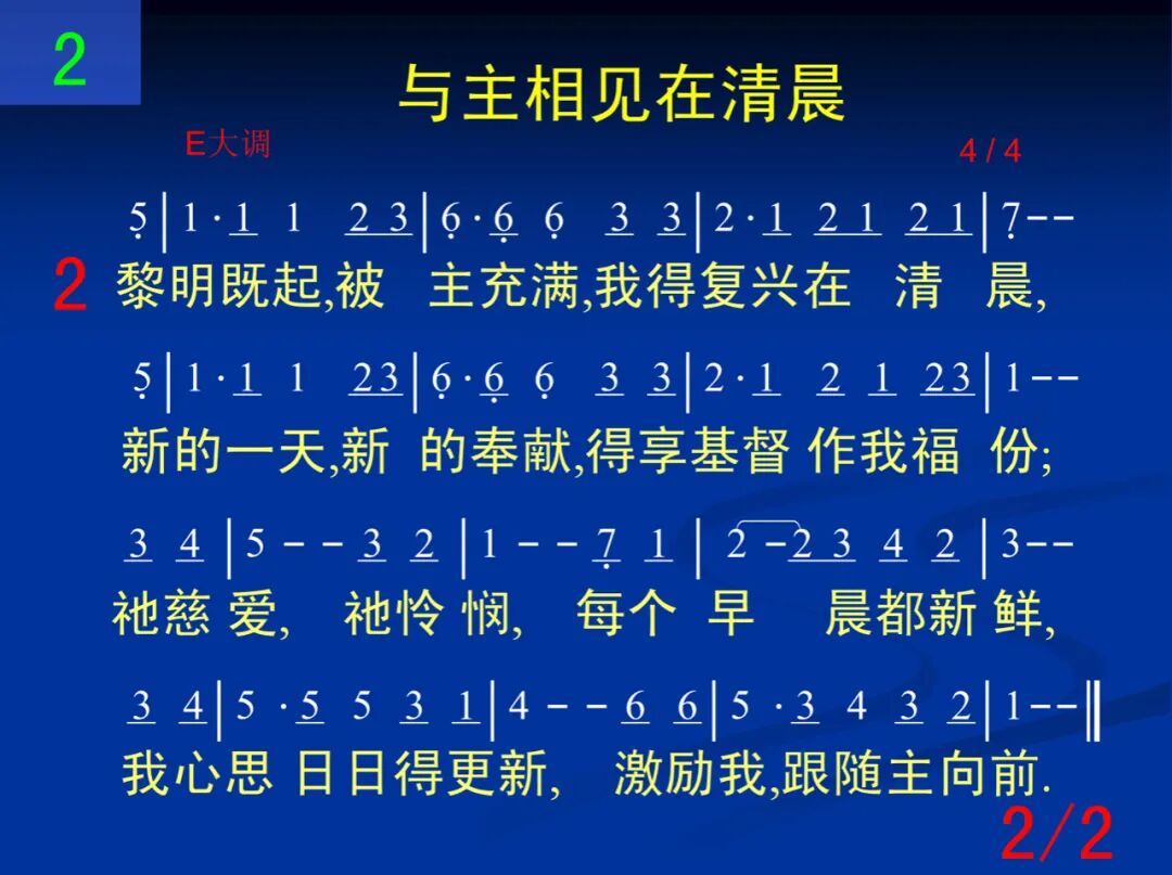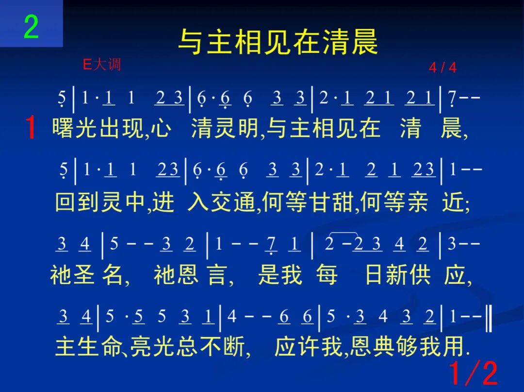 曙光出现,心清灵明,与主相见在清晨,回到灵中,进入交通何等甘甜,何等亲近;祂圣名,祂恩言,是我每日新供应,主生命亮光总不断,应许我,恩典够我用。 二 黎明既起,被主充满,我得复兴在清晨,新的一天,新的奉献,得享基督作我福份;祂慈爱,祂怜悯,每个早晨都新鲜,我心思日日得更新,激励我,跟随主向前。