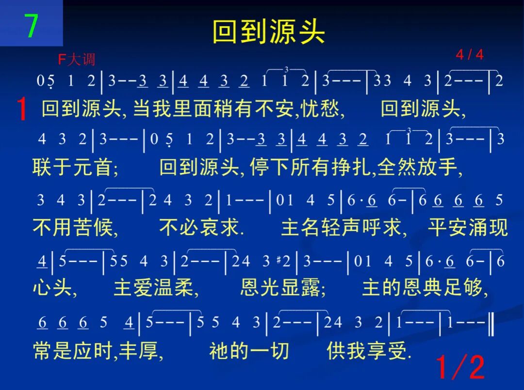 回到源头,当我里面稍有不安,忧愁,回到源头,联于元首;回到源头,停下所有挣扎,全然放手,不用苦候,不必哀求。主名轻声呼求,平安涌现心头,主爱温柔,恩光显露;主的恩典足够,常是应时,丰厚,祂的一切供我享受。 回到源头,这个生活充满喜乐,自由,回到源头,联于元首;回到源头,我无别的秘诀,就是持守,灵中交流,随主而走。我要大大张口,抛开所有烦忧,将我充满,将我浸透;我要举起双手,日夜向祂歌讴,我心所爱,我心所投。