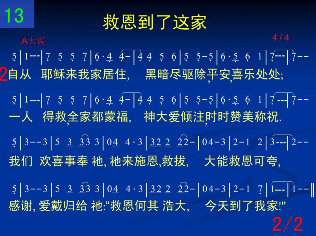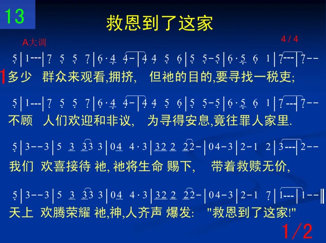 多少群众来观看,拥挤,但祂的目的,要寻找一税吏;不顾人们欢迎和非议,为寻得安息,竟往罪人家里。我们欢喜接待祂,祂将生命赐下,带着救赎无价,天上欢腾荣耀祂,神,人齐声爆发:“救恩到了这家!“ 二 自从耶稣来我家居住,黑暗尽驱除,平安,喜乐处处;一人得救,全家都蒙福,神大爱倾注,时时赞美称祝。我们欢喜事奉祂,祂来施恩,救拔,大能救恩可夸,感谢,爱戴归给祂:“救恩何其浩大,今天到了我家!“